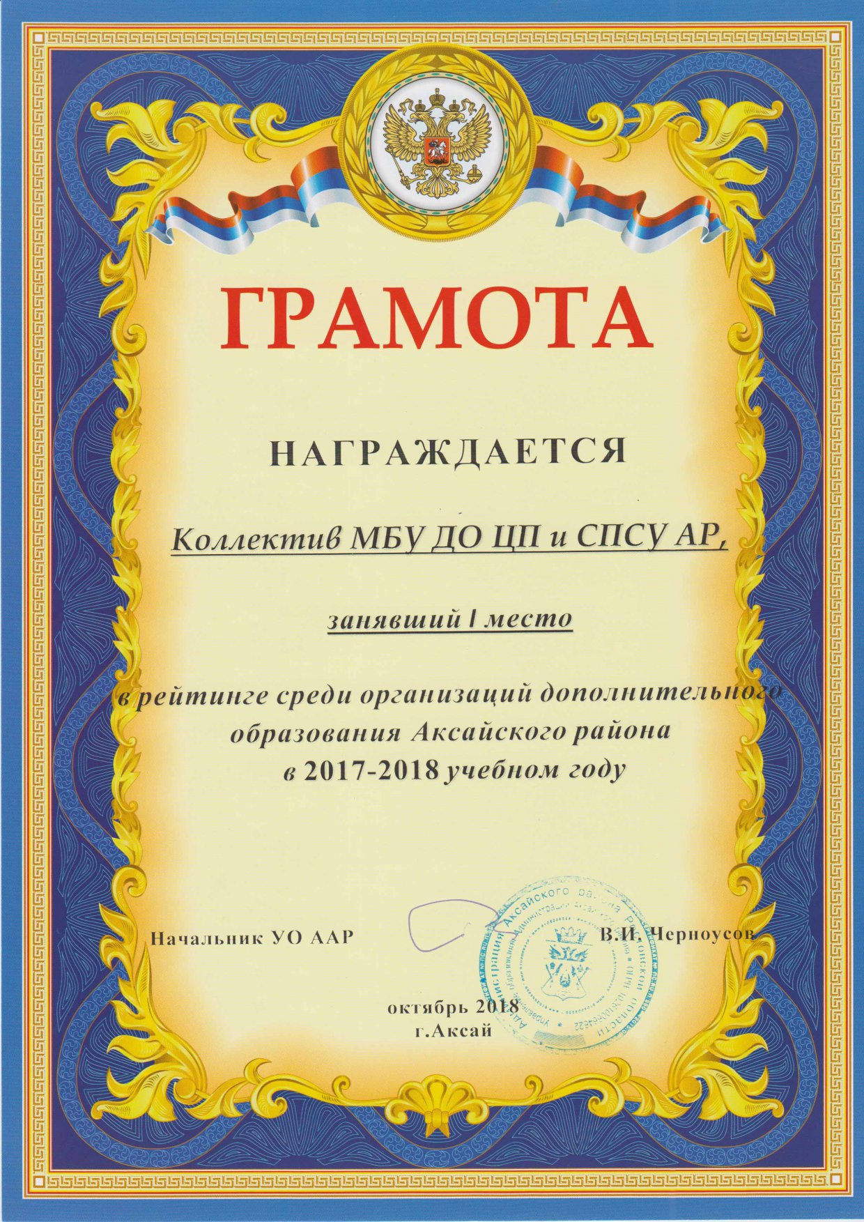 По итогам рейтинга методических служб среди организаций дополнительного образования Аксайскогого района за 2017-2018 уч. год, от имени Управления образования Администрации Аксайского района коллектив Центра профориентации Аксайского района награжден Диплом за I-ое место в рейтинге.