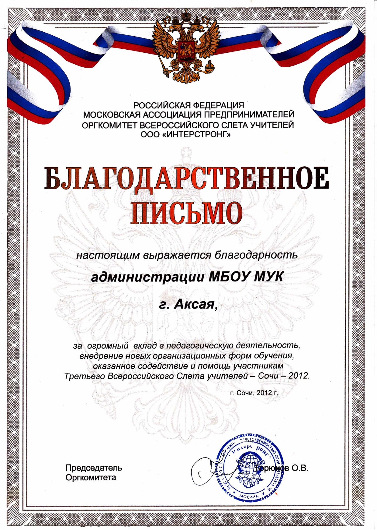 Благодарственное письмо Оргкомитета Всероссийского слета учителей Московской ассоциации предпринимателей ООО "Интерстронг", "за огромный вклад в педагогическую деятельность, внедрение новых организационных форм обучения и оказанное содействие и помощь участникам Третьего Всероссийского Слета учителей - Сочи - 2012.