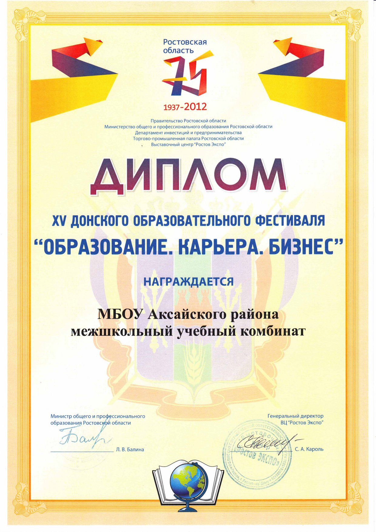 Диплом XV Донского образовательного фестиваля "Образование. Карьера. Бизнес", организованный Торгово-промышленной палатой Ростовской области Департамента инвестиций и предпринимательства, совместно с Министерством общего и профессионального образования Ростовской области в 2012 году.
